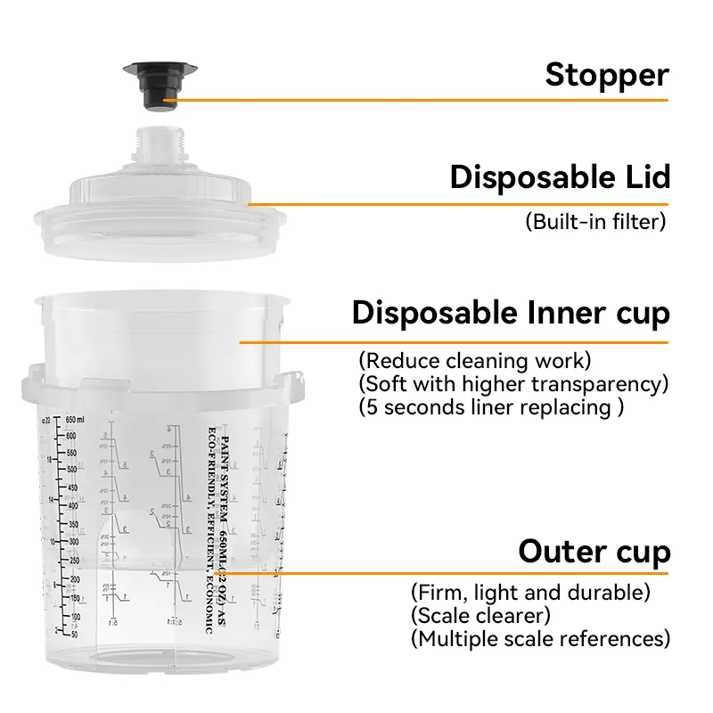 Ο διαφανής σχεδιασμός του κυπέλλου διευκολύνει την παρατήρηση της υπόλοιπης βαφής. Το κύπελλο ψεκασμού μίας χρήσης εξασφαλίζει ότι το πιστόλι ψεκασμού μπορεί να ψεκάζει 360 μοίρες χωρίς να διαρρέει χρώμα, το οποίο μπορεί να περάσει την επιφάνεια της μόλυνσης των κόκκων ξύλου που προκαλείται από τη βαφή. Είναι κατάλληλο για ψεκασμό βαφής PU/NC σε ξύλινες πόρτες, ντουλάπια και έπιπλα από στερεό ξύλο.