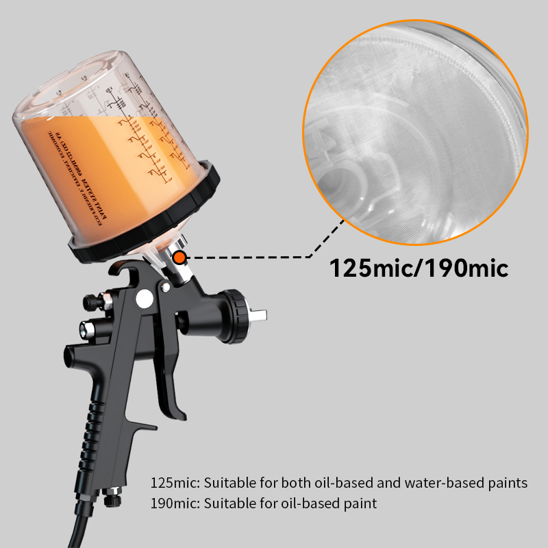 • Ενσωματωμένα ενσωματωμένα φίλτρα για ανώτερο φινίρισμα βαφής: Το καπάκι του δοχείου ψεκασμού μιας χρήσης διαθέτει ενσωματωμένα φίλτρα 190μ (βαφή με βάση το λάδι) και 125μ (βαφή με βάση το νερό), φιλτράροντας αποτελεσματικά τις ακαθαρσίες κατά τον ψεκασμό και αυξάνοντας τη γυαλάδα του χρώματος κατά 20%.