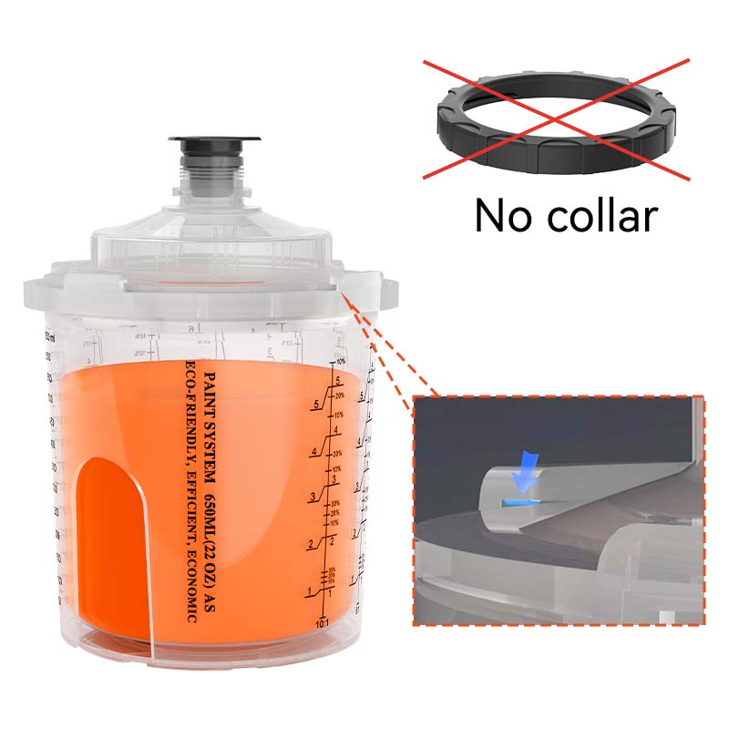 Το κολάρο, το οποίο σχηματίζει μια σφιχτή σύνδεση μεταξύ του κυπέλλου και του καπακιού, είναι από καιρό ένα κρίσιμο συστατικό στα συστήματα κυπέλλου ψεκασμού μίας χρήσης. Κατά τη διάρκεια των πολυάσχολων περιόδων ζωγραφικής, οι ζωγράφοι συχνά χάνουν ή βλάπτουν το κολάρο, εμποδίζοντας σωστά το κύπελλο ψεκασμού μίας χρήσης, δημιουργώντας σημαντικές προκλήσεις.